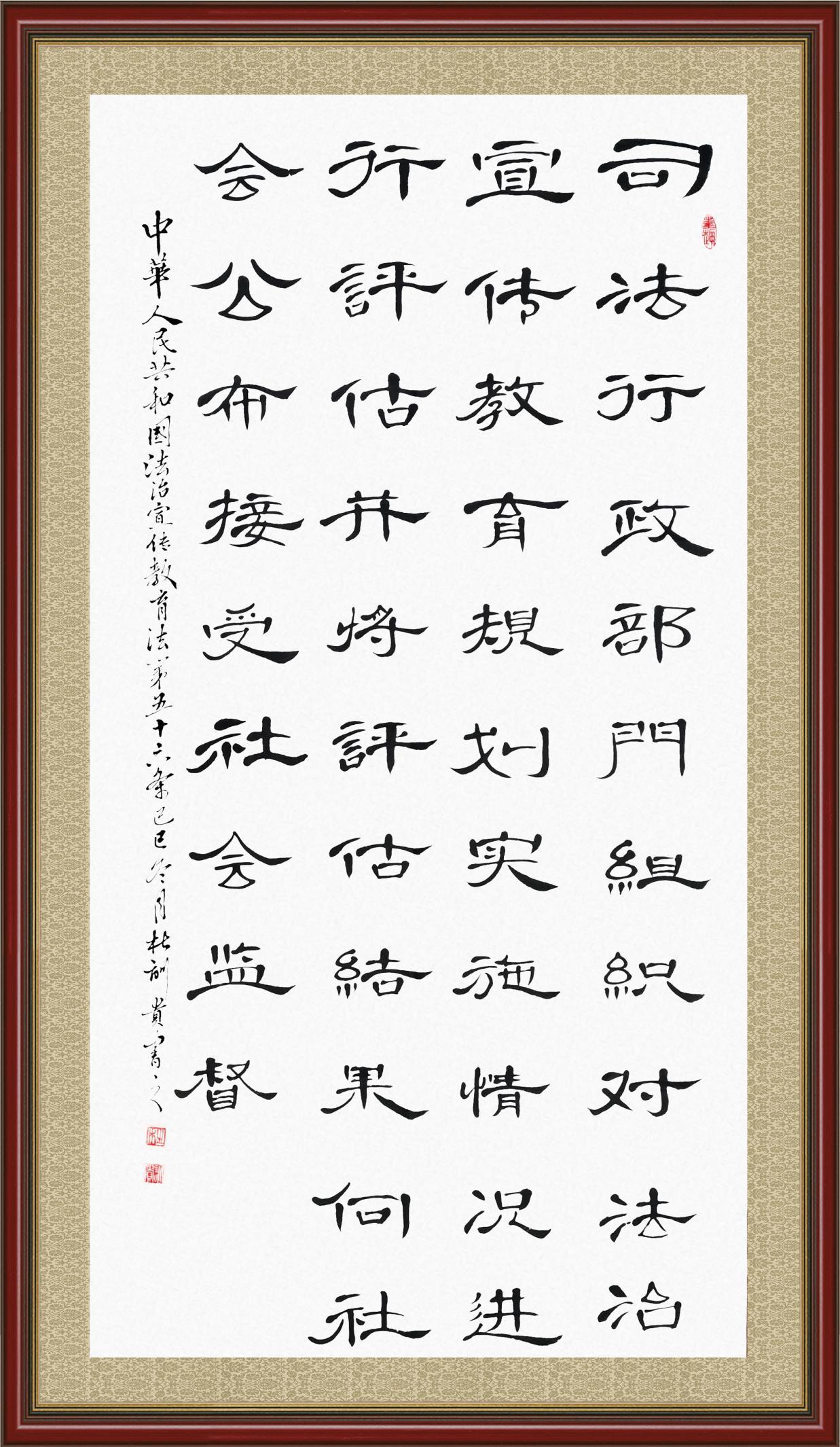 2020年7月11日,由法治日?qǐng)?bào)社主辦的“書·法”系列活動(dòng)正式啟動(dòng),先后書寫《中華人民共和國民法典》《中華人民共和國憲法》《中華人民共和國民營經(jīng)濟(jì)促進(jìn)法》等21部法律法規(guī)。