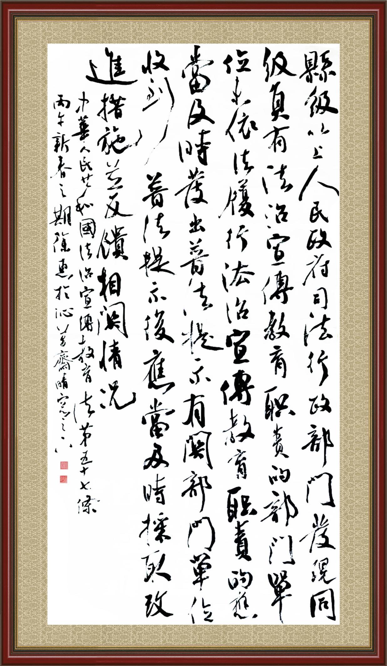 2020年7月11日,由法治日?qǐng)?bào)社主辦的“書·法”系列活動(dòng)正式啟動(dòng),先后書寫《中華人民共和國(guó)民法典》《中華人民共和國(guó)憲法》《中華人民共和國(guó)民營(yíng)經(jīng)濟(jì)促進(jìn)法》等21部法律法規(guī)。