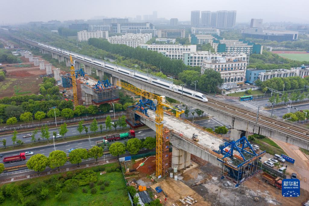 中鐵四局四公司的工程人員在江蘇南沿江城際鐵路站前Ⅰ標(biāo)工程跨天元東路連續(xù)梁施工點(diǎn)施工作業(yè)(2021年4月27日攝,無(wú)人機(jī)照片)。新華社記者 李博 攝