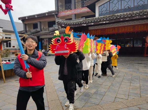 在舞燈時(shí),制作精巧的“龍頭”在前引路,孩子們?cè)谖椠垷舻陌樽嘞?,為團(tuán)結(jié)村的村民們帶來(lái)了別具一格的舞龍燈的表演,現(xiàn)場(chǎng)歡聲笑語(yǔ)不斷。