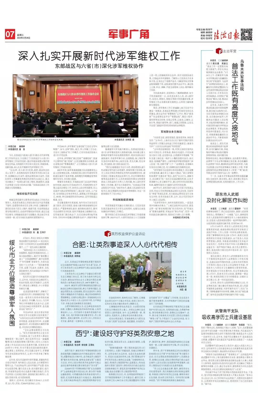 兩年來,西寧軍事檢察院還多次協(xié)調(diào)組織駐地部隊官兵開展“護英烈鑄忠誠”等主題黨日活動,官兵定期輪流幫助陵園管護人員清除雜草、修繕紀(jì)念設(shè)施。該院辦理的兩起行政公益訴訟案件入選為全國紅色資源保護典型案例,3縣烈士陵園也成為當(dāng)?shù)刂攸c紅色教育基地。