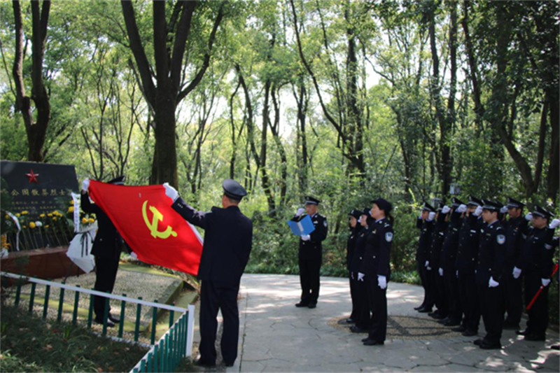 上午10時許,祭掃儀式開始。全體民輔警整裝列隊,肅立烈士墓碑前,在莊嚴(yán)肅穆的氛圍中,王永生、杜杰同志緩步上前,向烈士墓碑及長眠在此的革命先烈敬獻(xiàn)花籃并為花籃梳理挽聯(lián)。隨后,全體人員脫帽肅立默哀,并向革命烈士敬獻(xiàn)鮮花。最后,面對莊嚴(yán)的黨旗,全體人員舉起右手重溫了入黨誓詞,表達(dá)了對黨的赤誠之心。