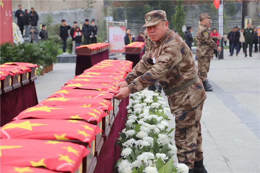 安葬儀式現(xiàn)場奏唱國歌,莊嚴肅穆,隨后逐一介紹集中安葬的60名烈士生平。全體人員脫帽,向革命烈士紀念碑和革命烈士默哀三分鐘。固鎮(zhèn)縣委相關(guān)負責同志宣讀祭文,現(xiàn)場三鞠躬后,人武專干、烈士親屬將烈士骨灰護送至墓穴安葬。參加活動人員依次向烈士獻花。