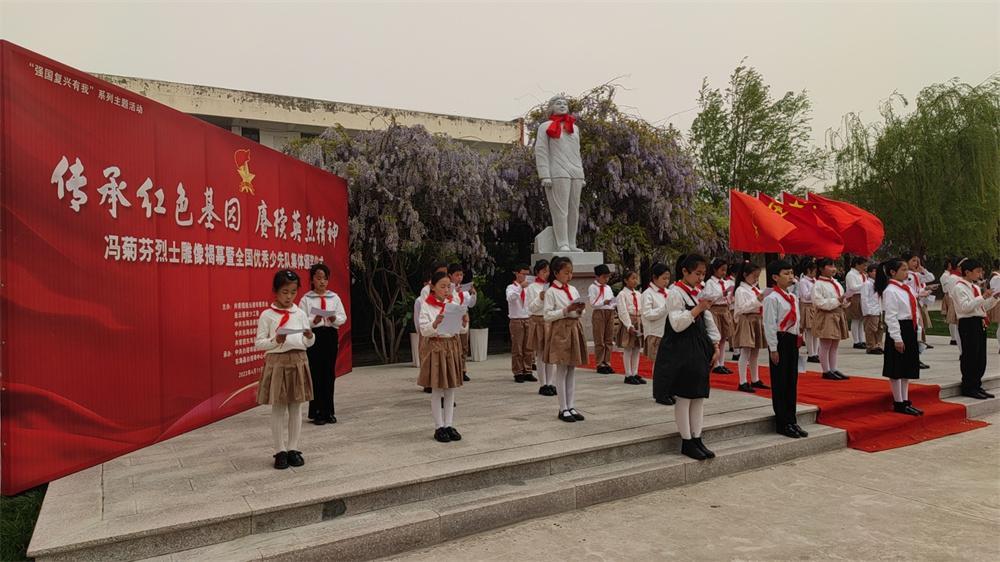活動(dòng)現(xiàn)場(chǎng),出席儀式的幾位領(lǐng)導(dǎo)和少先隊(duì)員代表緩緩地為“雨花英烈”之一的馮菊芬烈士塑像揭幕,褪去紅布的烈士塑像在藍(lán)天白云下愈顯純潔高大、莊嚴(yán)而肅穆。