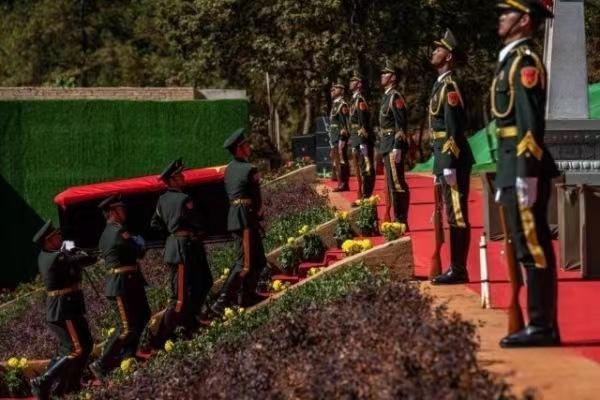 烈士陵園里,高聳的紀念碑引人注目。隨著烈士棺槨輕輕安放入墓,全體人員向烈士三鞠躬。隨后,現(xiàn)場的人們依次向烈士獻花致敬。
