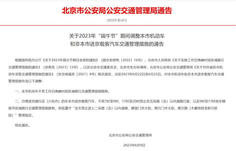中新網(wǎng)6月14日電據(jù)北京市公安局公安交通管理局網(wǎng)站消息,北京市公安局公安交通管理局近日發(fā)布通告稱,根據(jù)國務(wù)院辦公廳《關(guān)于2023年部分節(jié)假日安排的通知》(國辦發(fā)明電〔2022〕16號)、北京市人民政府《關(guān)于實(shí)施工作日高峰時(shí)段區(qū)域限行交通管理措施的通告》(京政發(fā)〔2023〕12號),以及北京市交通委員會、北京市生態(tài)環(huán)境局、北京市公安局公安交通管理局《關(guān)于對外省區(qū)市機(jī)動車采取交通管理措施的通告》(京交綠通發(fā)〔2021〕4號)相關(guān)規(guī)定,決定2023年6月22日至6月25日,對本市機(jī)動車和非本市進(jìn)京載客汽車交通管理措施作出以下調(diào)整: