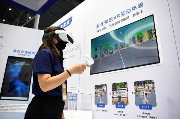 一家參展企業(yè)代表在2022年國家網(wǎng)絡(luò)安全宣傳周網(wǎng)絡(luò)安全博覽會上演示反詐知識VR互動體驗(yàn)項(xiàng)目(2022年9月4日攝)