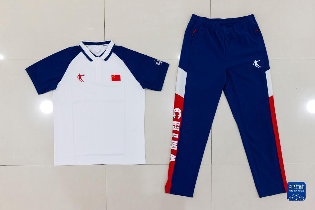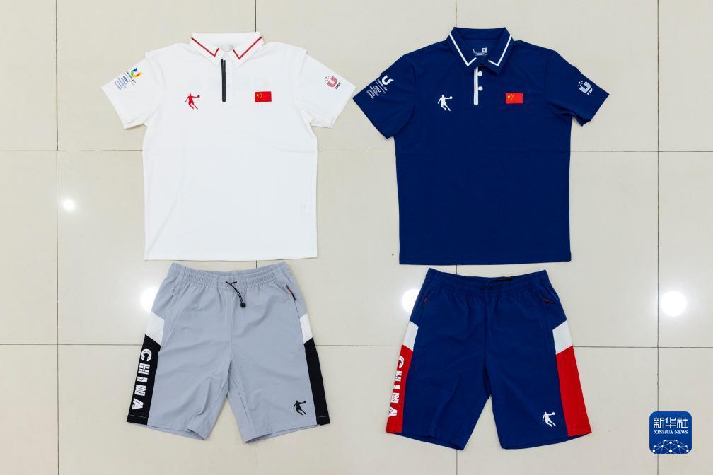 這是7月24日拍攝的第31屆世界大學(xué)生夏季運動會中國代表團(tuán)成員配發(fā)裝備中的POLO短T恤衫和長褲。新華社記者 沈伯韓 攝
