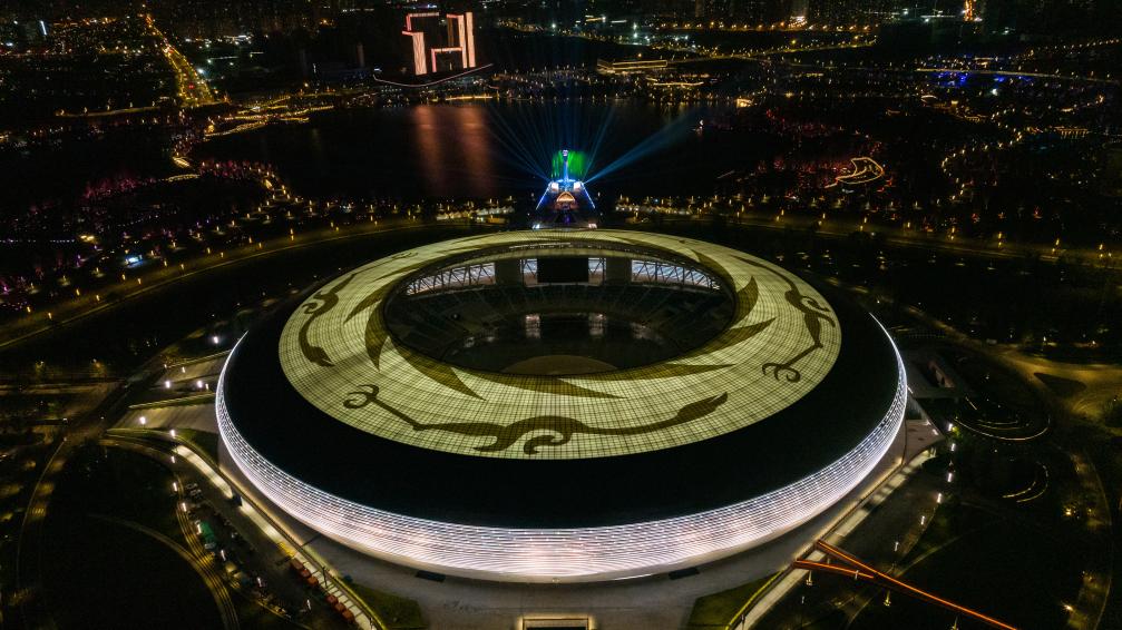 ↑這是4月19日拍攝的第31屆世界大學(xué)生夏季運動會開幕式主體育場及主火炬(無人機照片)