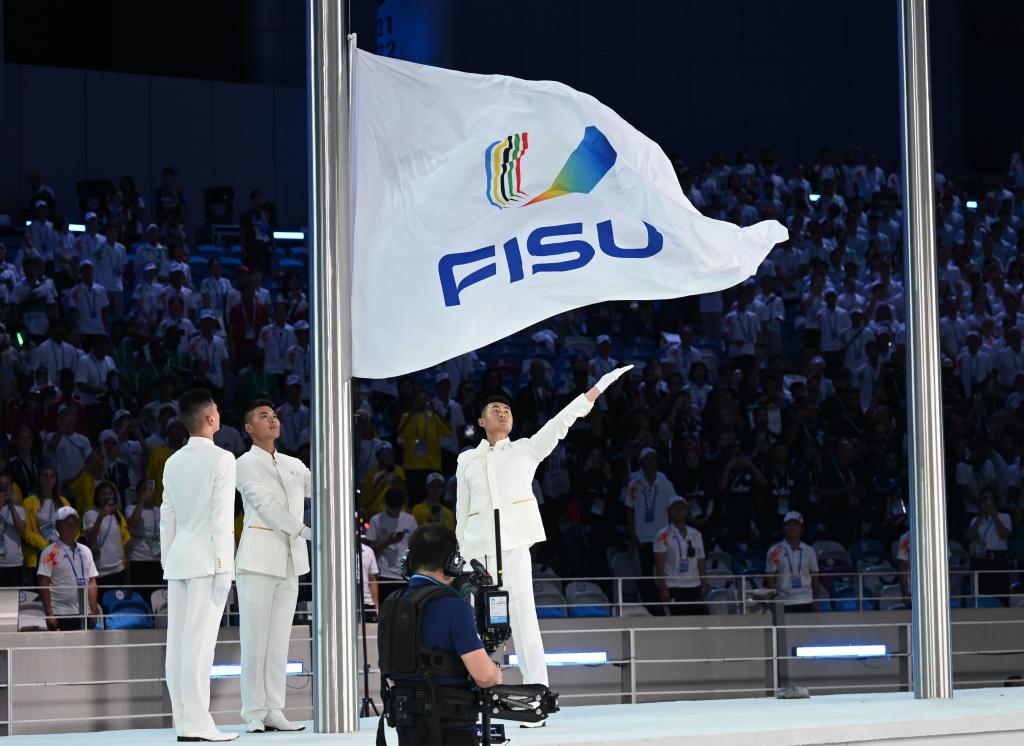 7月28日,國際大學生體育聯(lián)合會會旗在開幕式上升起。新華社記者胥冰潔攝