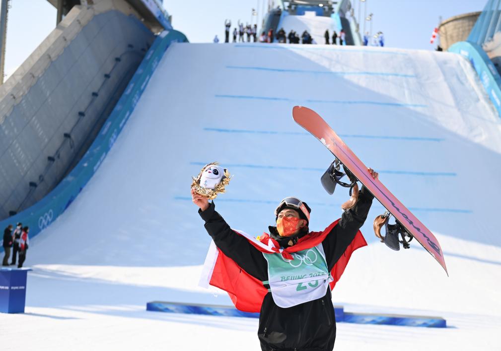 2022年2月15日,中國選手蘇翊鳴在頒發(fā)紀念品儀式后。當日,北京2022年冬奧會單板滑雪男子大跳臺決賽在北京首鋼滑雪大跳臺舉行。中國選手蘇翊鳴奪得金牌。新華社記者黃宗治攝