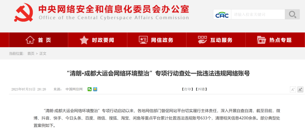 中央網(wǎng)信辦通報(bào)了部分典型處置案例,包括傳播大運(yùn)會(huì)謠言信息、利用“偽公益”惡意營(yíng)銷炒作、假冒仿冒賬號(hào)發(fā)布信息、發(fā)布涉大運(yùn)會(huì)違規(guī)售賣信息等。