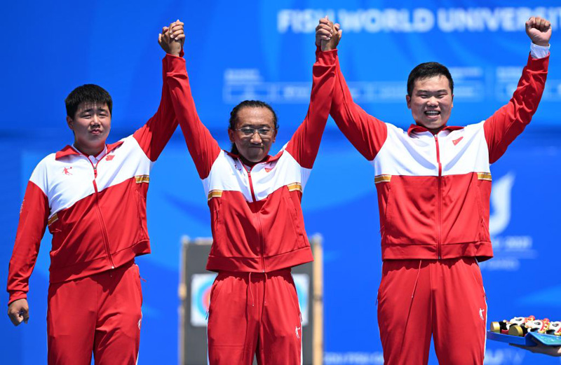 7月30日,中國隊選手陳巖松、杜美余、王世坤(從左至右)在頒獎儀式上。當(dāng)日,在成都舉行的第31屆世界大學(xué)生夏季運(yùn)動會男子復(fù)合弓團(tuán)體金牌賽中,中國隊以231環(huán):224環(huán)戰(zhàn)勝法國隊,獲得冠軍。新華社記者 張龍 攝
