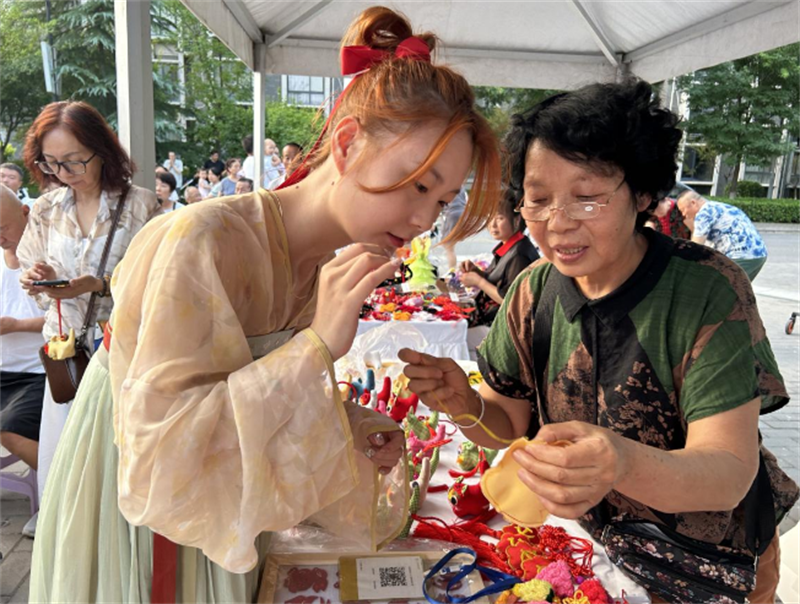 在民俗文化體驗(yàn)區(qū),幾位身著華彩漢服的年輕人在非遺傳承老師的指導(dǎo)下,凝神屏氣,手執(zhí)五色絲線,連續(xù)穿針引線……“穿針乞巧”活動(dòng)吸引了眾多市民駐足觀看?!斑@個(gè)活動(dòng)特別有意思,讓我們這些‘00’后能親手體驗(yàn)這些非常陌生的傳統(tǒng)手藝,了解感受中華傳統(tǒng)文化的深厚底蘊(yùn)?!笔忻耜惻磕弥约簞?dòng)手制作的扎花說(shuō)。另一邊,一道“古詩(shī)詞鵲橋”吸引了眾多市民打卡留影,帶領(lǐng)大家了解“七夕節(jié)”的起源、習(xí)俗,重溫牛郎織女的美麗愛情故事,認(rèn)知傳統(tǒng)文化風(fēng)韻……一系列特色民俗文化活動(dòng),讓市民們乘興而歸。