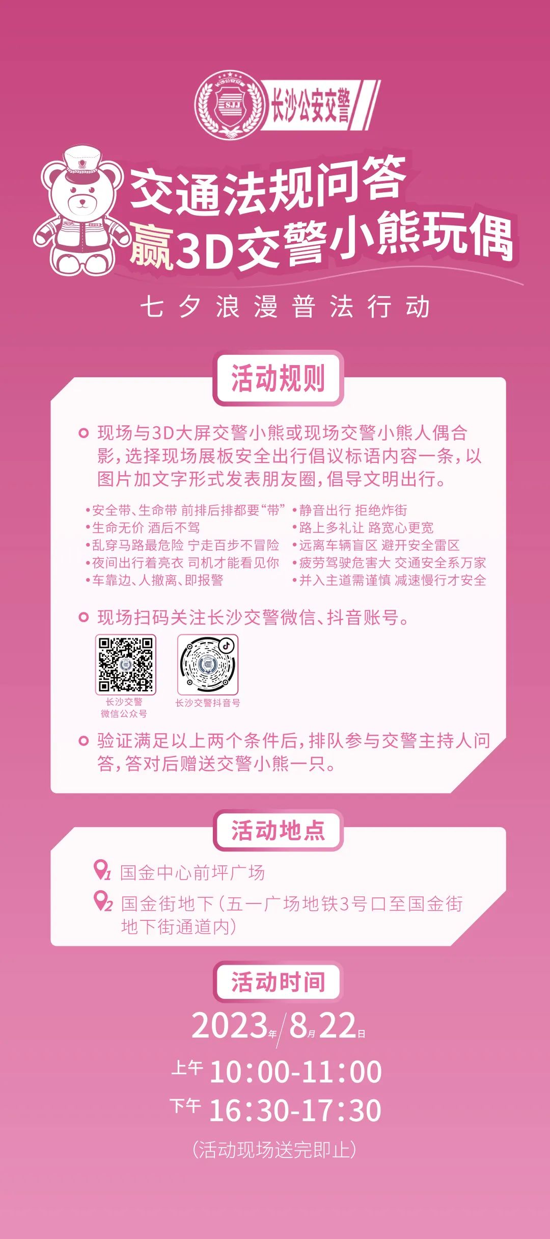 “七夕”當(dāng)天(上午10:00-11:00、下午16:30-17:30),分別在國金中心前坪和國金街地下通道大屏前設(shè)置兩個普法互動打卡點(diǎn),開展普法宣教互動贈送長沙交警小熊玩偶活動?,F(xiàn)場民警將開展普法宣傳,邀請市民參與“交通法規(guī)問答贏交警小熊玩偶”活動, 通過答題和游戲互動可獲得“交警小熊”玩偶一只。(注意,是必得哦)