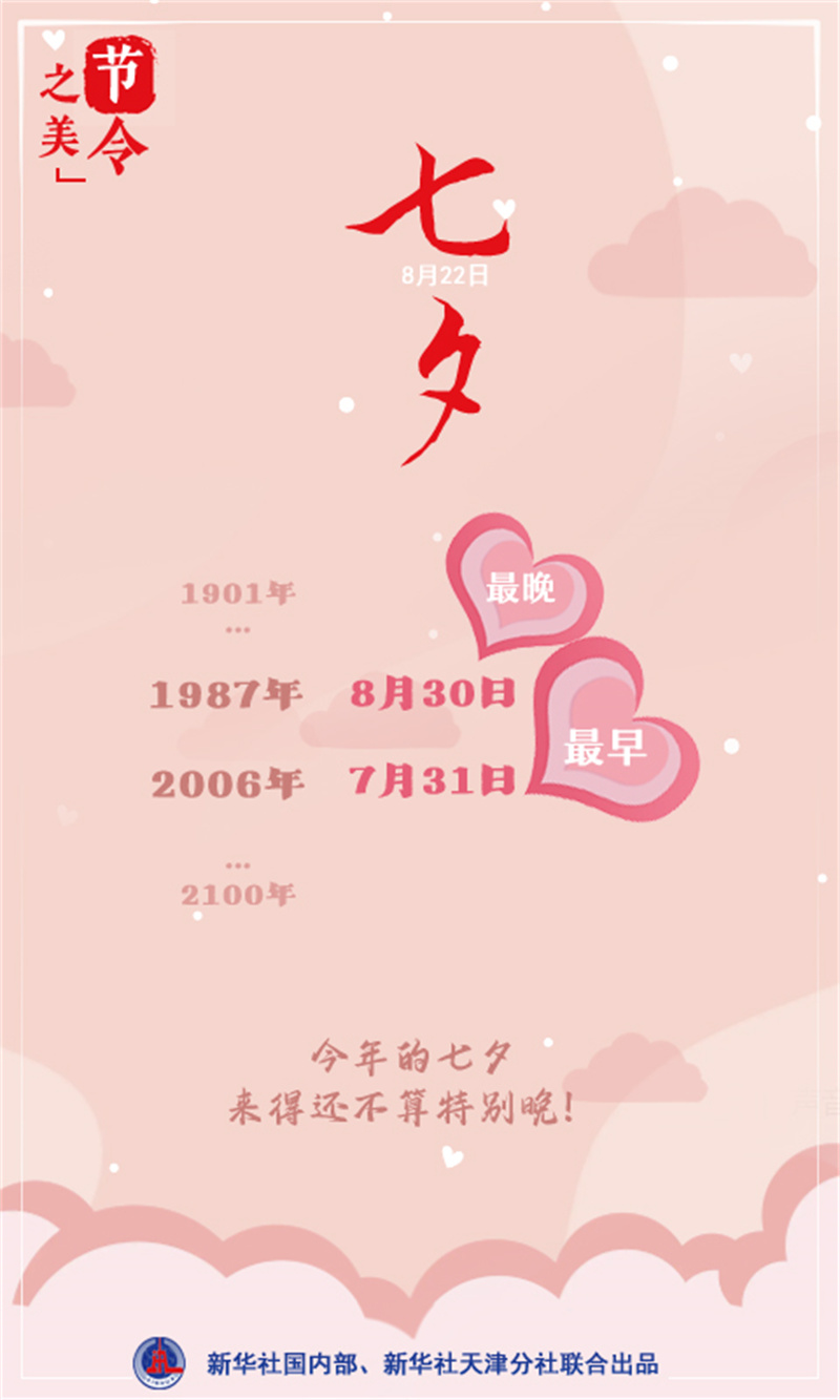今年的七夕是來得最晚的嗎?不是!1901年至2100年這200年的統(tǒng)計結(jié)果顯示,七夕對應(yīng)的公歷日期最早可落在7月31日(如2006年),最晚可落在8月30日(如1987年),這也意味著,公歷7月31日至8月30日中的任何一天都有可能成為七夕。照此來看,今年的七夕來得還不算特別晚。