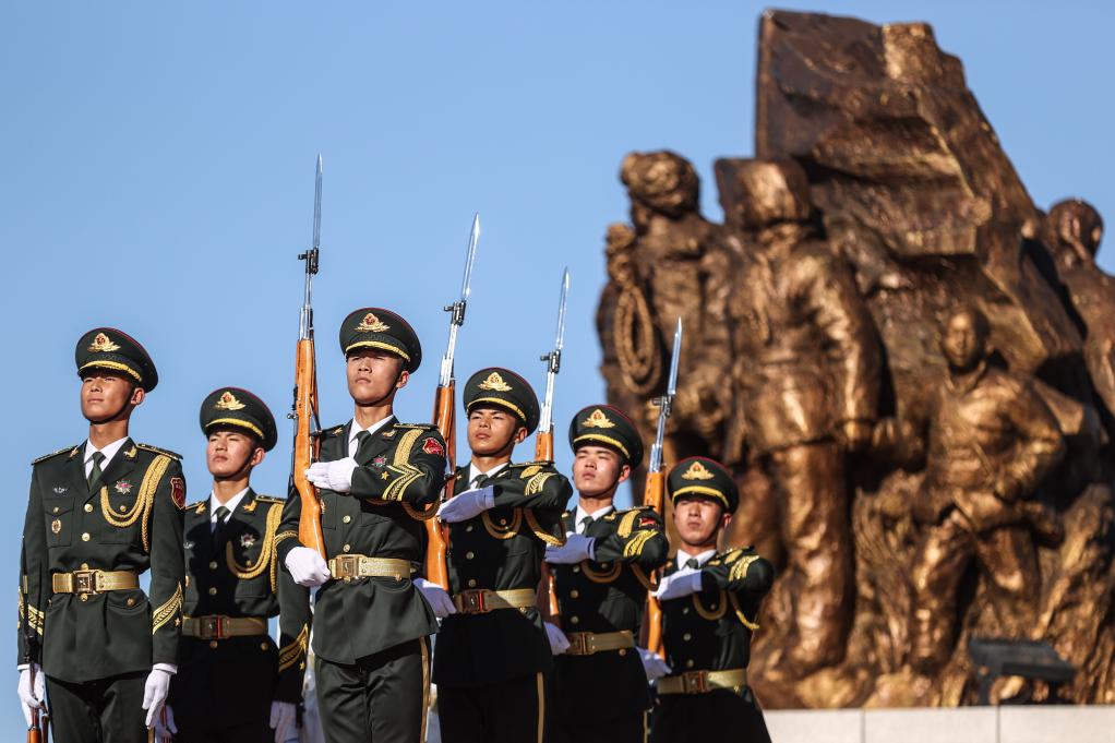 2020年10月23日,在丹東抗美援朝紀(jì)念塔敬獻(xiàn)花籃儀式上,禮兵在儀式中準(zhǔn)備。