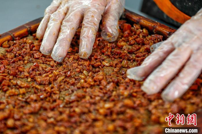 9月19日,在安徽省黃山市徽州區(qū)澄塘村,制餅手藝人正在制作火腿餡料。施亞磊 攝