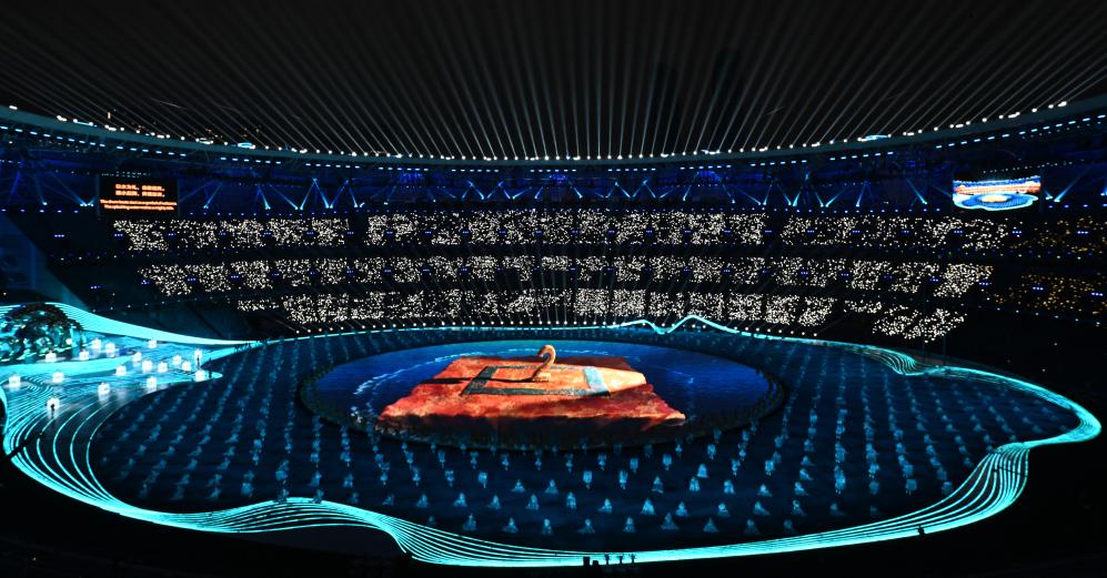 開幕式實現(xiàn)了兩個首創(chuàng):3D雙威亞首次應(yīng)用于大型運(yùn)動場,首次采用“數(shù)實融合”的點火方式。