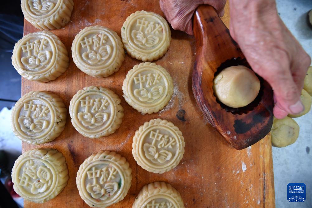 9月20日,在河北省石家莊市井陘縣天長鎮(zhèn)的一家手工月餅作坊里,老師傅使用傳統(tǒng)手藝制作月餅。