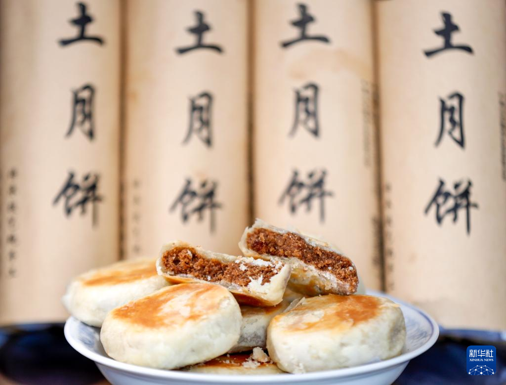 9月19日,在安徽省黃山市徽州區(qū)澄塘村一家月餅作坊,工人展示剛剛烘烤出的火腿土月餅。