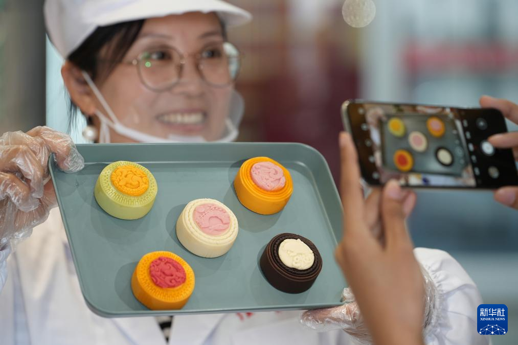 9月19日,在河北省石家莊市藁城區(qū)黃莊村一家月餅生產(chǎn)企業(yè),工作人員向顧客展示文創(chuàng)月餅。