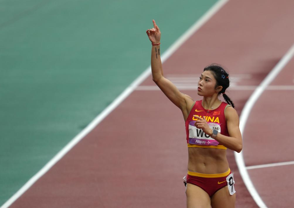 9月30日,中國(guó)選手吳艷妮在田徑項(xiàng)目女子100米欄預(yù)賽比賽后慶祝。新華社記者 江文耀 攝