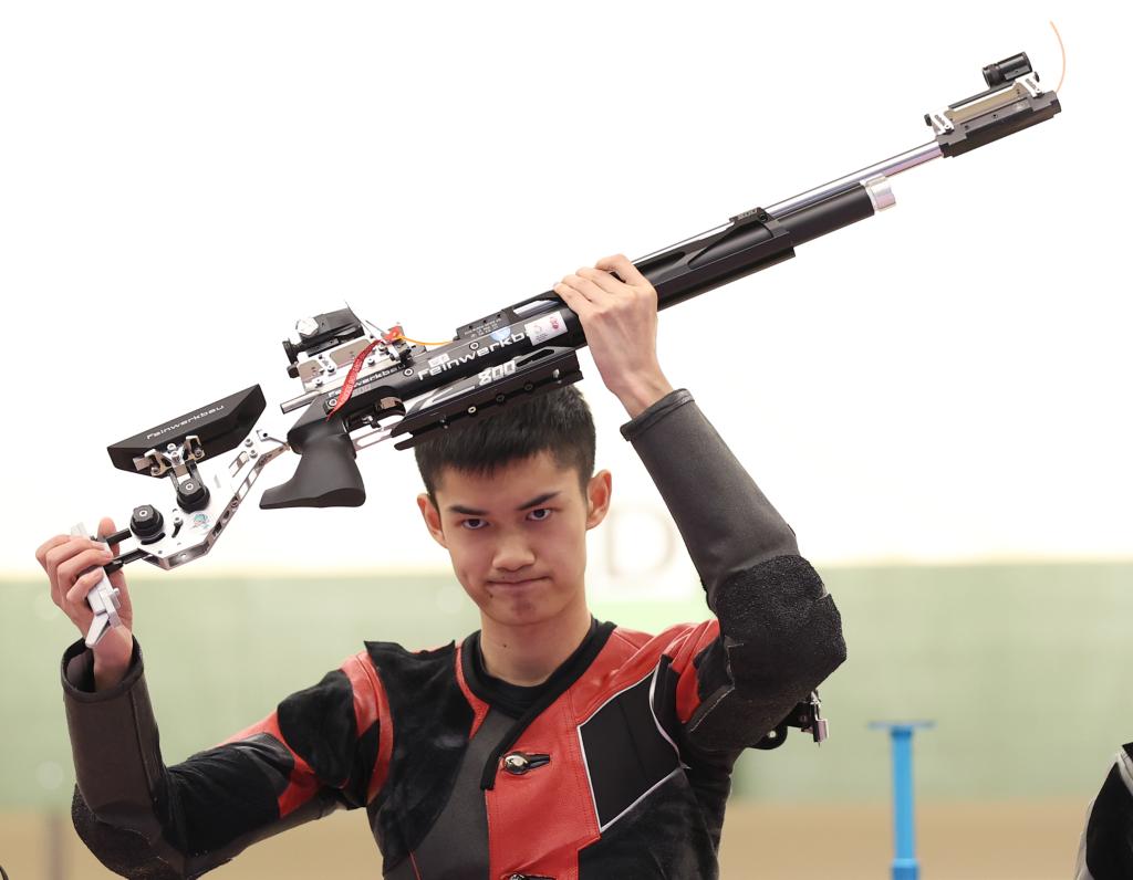 9月25日,杭州亞運(yùn)會(huì)射擊項(xiàng)目男子10米氣步槍個(gè)人決賽中,中國(guó)選手盛李豪以253.3環(huán)的成績(jī)奪冠,并打破該項(xiàng)目世界紀(jì)錄。新華社記者 賈浩成 攝