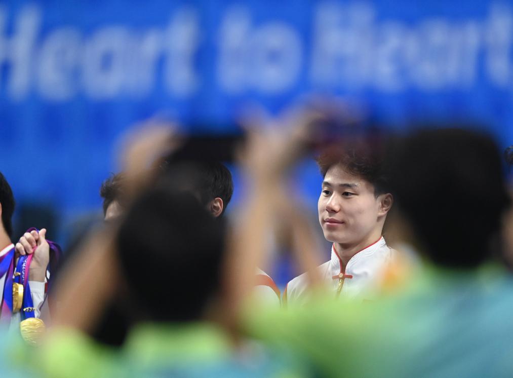 9月29日,中國(guó)選手覃海洋與隊(duì)友在賽后合影。新華社記者 黃宗治 攝