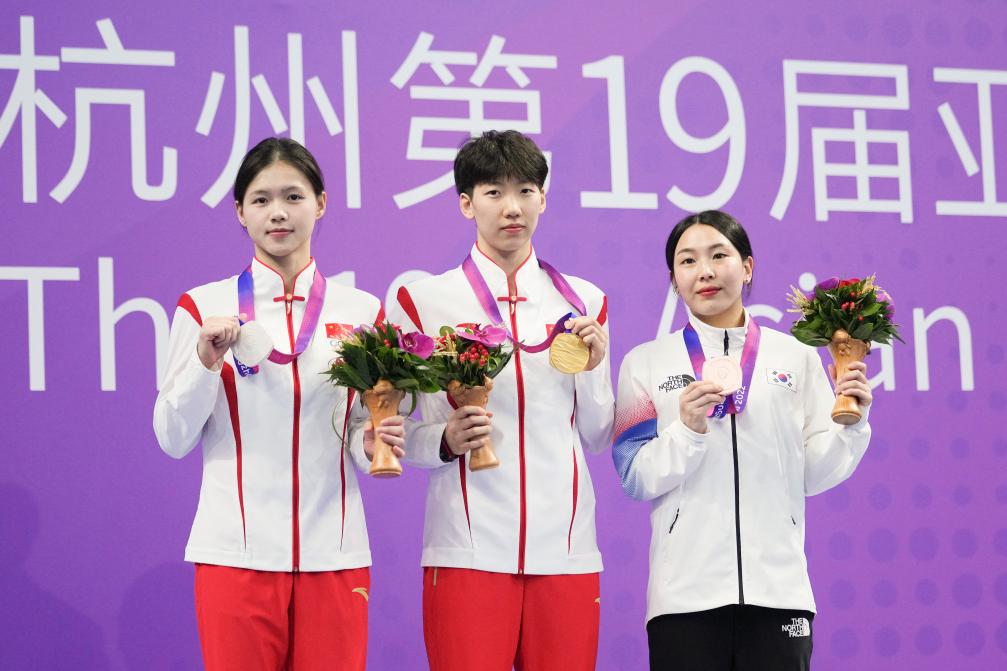 新華社杭州10月2日電(記者夏亮、周欣、李嘉)中國跳水隊在本屆亞運會上的“金牌收割”仍在繼續(xù)。在2日進行的男、女1米板決賽中,中國隊分別包攬冠亞軍。