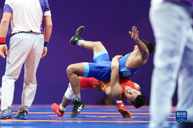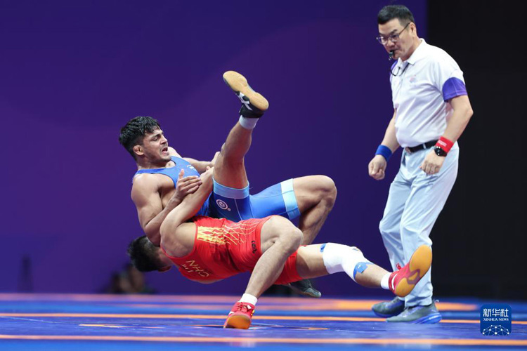 當日,在杭州亞運會摔跤項目男子古典式77公斤級四分之一決賽中,中國選手劉瑞戰(zhàn)勝印度選手維卡斯,晉級半決賽。