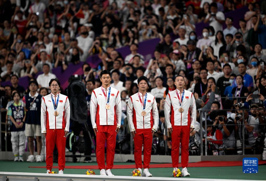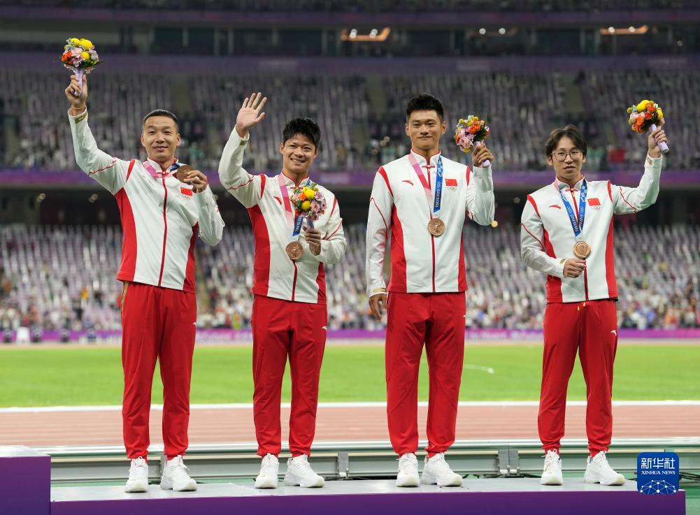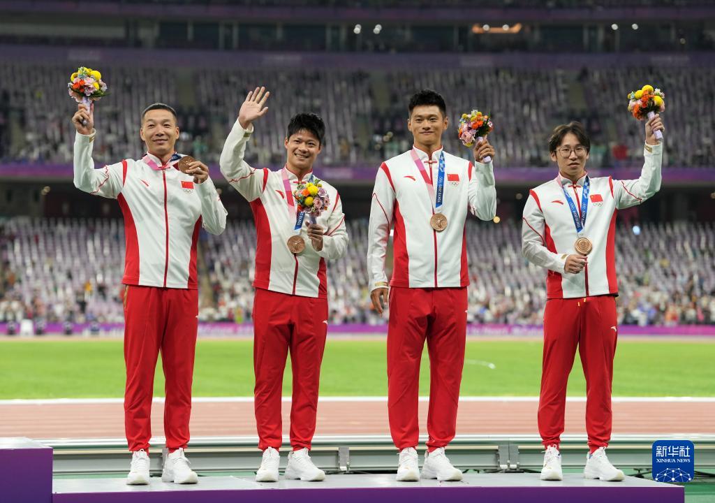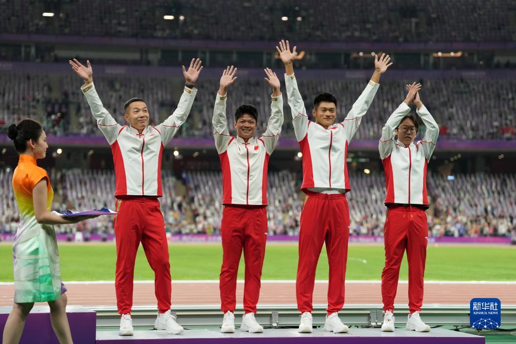 10月4日,湯星強(qiáng)、謝震業(yè)、蘇炳添、吳智強(qiáng)(從右至左)在頒獎(jiǎng)儀式后展示獎(jiǎng)牌。