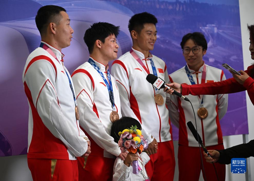 10月4日,湯星強(qiáng)、謝震業(yè)、蘇炳添、吳智強(qiáng)(從右至左)在頒獎(jiǎng)儀式后接受采訪(fǎng)。