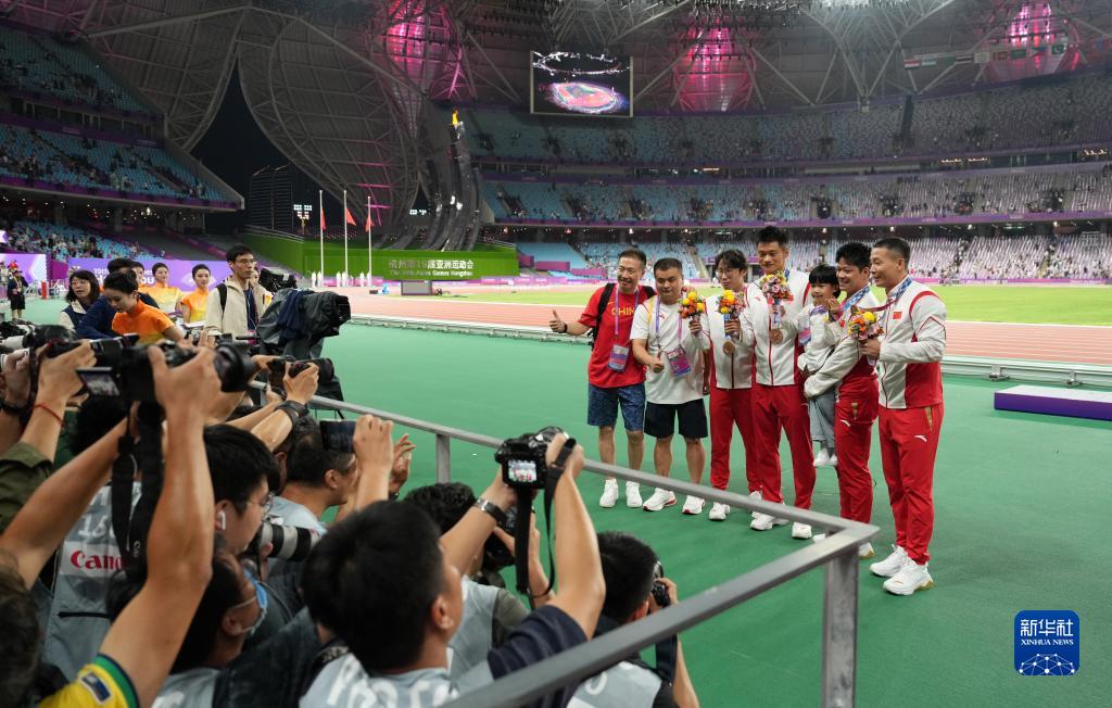 10月4日,湯星強(qiáng)、謝震業(yè)、蘇炳添、吳智強(qiáng)(從右二至右五)在頒獎(jiǎng)儀式后。