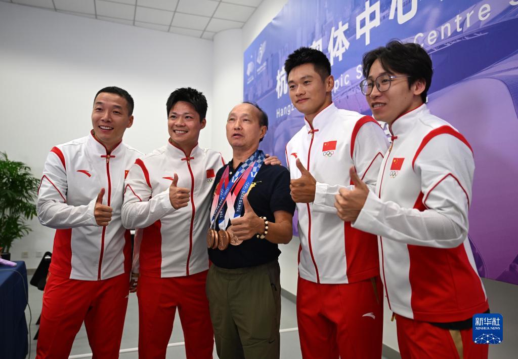 10月4日,吳智強(qiáng)、蘇炳添、蘇炳添的兒子蘇浩宸、謝震業(yè)、湯星強(qiáng)(右一至右五)在頒獎(jiǎng)儀式后合影。