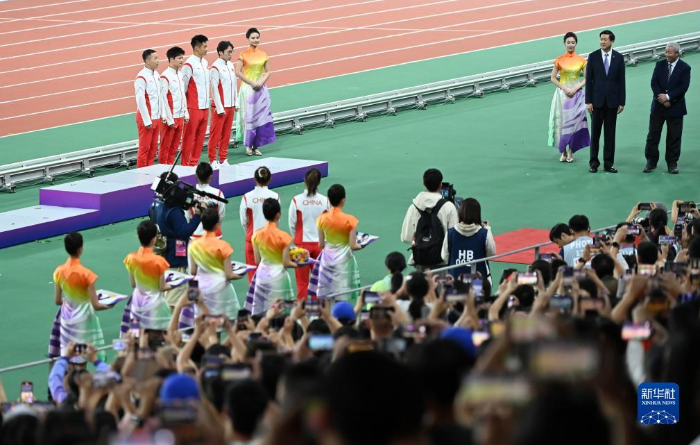 當(dāng)晚,杭州亞運(yùn)會(huì)田徑項(xiàng)目比賽結(jié)束后,中國(guó)奧委會(huì)在杭州奧體中心體育場(chǎng)舉行遞補(bǔ)奧運(yùn)獎(jiǎng)牌頒獎(jiǎng)儀式,為遞補(bǔ)獲得東京奧運(yùn)會(huì)男子4X100米接力銅牌的蘇炳添、謝震業(yè)、吳智強(qiáng)和湯星強(qiáng)與遞補(bǔ)獲得2012年倫敦奧運(yùn)會(huì)女子20公里競(jìng)走金、銀、銅牌的切陽(yáng)什姐、劉虹、呂秀芝頒發(fā)獎(jiǎng)牌。