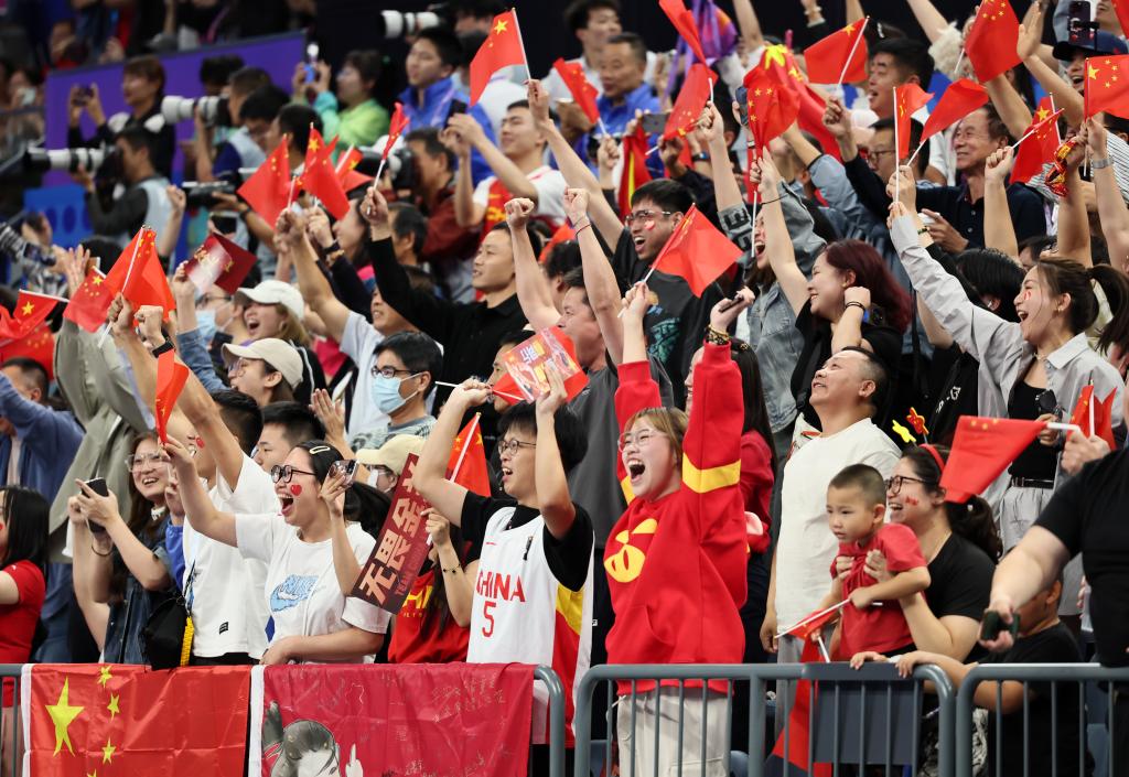杭州亞運(yùn)會(huì)女籃決賽,觀眾在看臺(tái)上為中國隊(duì)加油助威。新華社記者蘭紅光攝