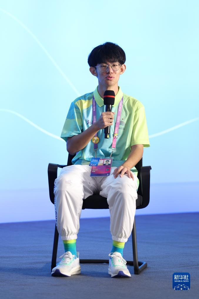 10月7日,杭州奧體中心籃球館競賽志愿者李冠霖在見面會(huì)現(xiàn)場發(fā)言。