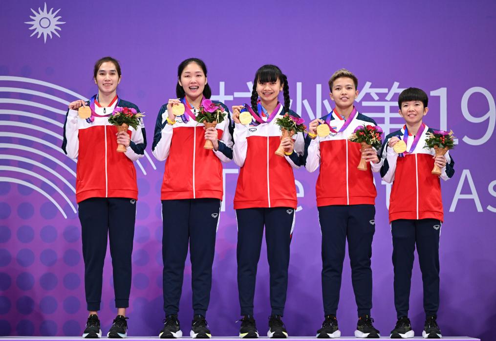 10月7日,杭州亞運(yùn)會(huì)藤球女子單組比賽落幕。冠軍泰國(guó)隊(duì)在頒獎(jiǎng)儀式上。新華社記者 陳鐘昊 攝