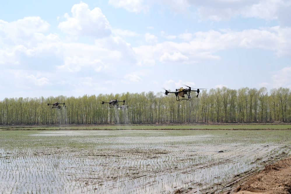 2023年5月,北大荒集團軍川農(nóng)場有限公司正使用植保無人機對剛剛插秧的地塊噴施液態(tài)返青肥。新華社記者黃騰 攝