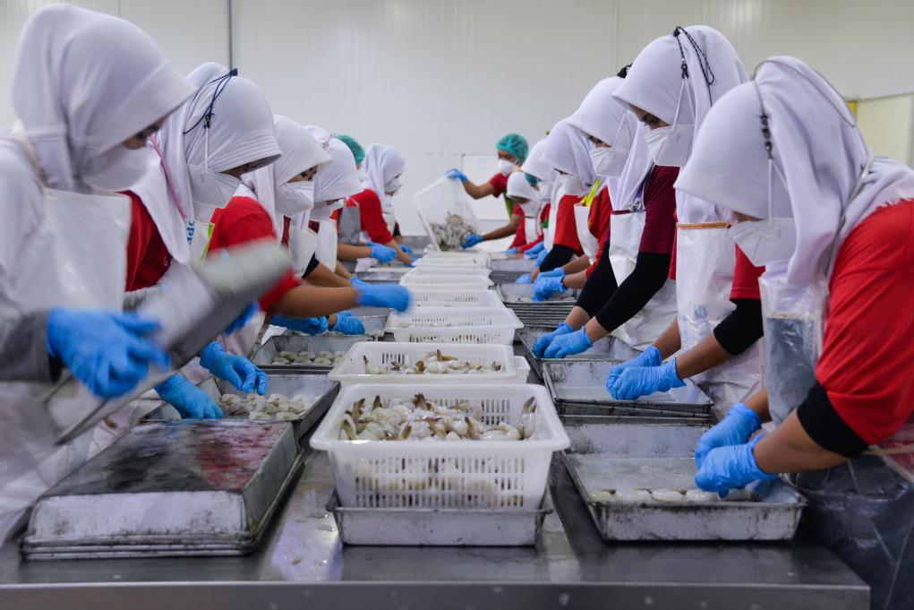 2023年8月29日,在印度尼西亞中爪哇省三寶壟市,工人在福建淼天匯食品有限公司印尼公司的對(duì)蝦加工生產(chǎn)線上工作。新華社記者 徐欽 攝