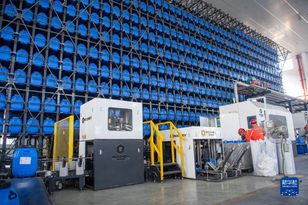 10月17日,在中國(guó)石化集團(tuán)重慶川維化工有限公司,工作人員在查看產(chǎn)品打包情況。