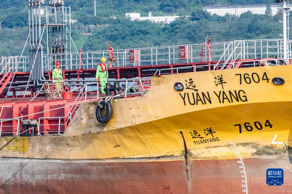 10月17日,在中國(guó)石化集團(tuán)重慶川維化工有限公司物流碼頭,工作人員在檢查出口產(chǎn)品裝船情況。