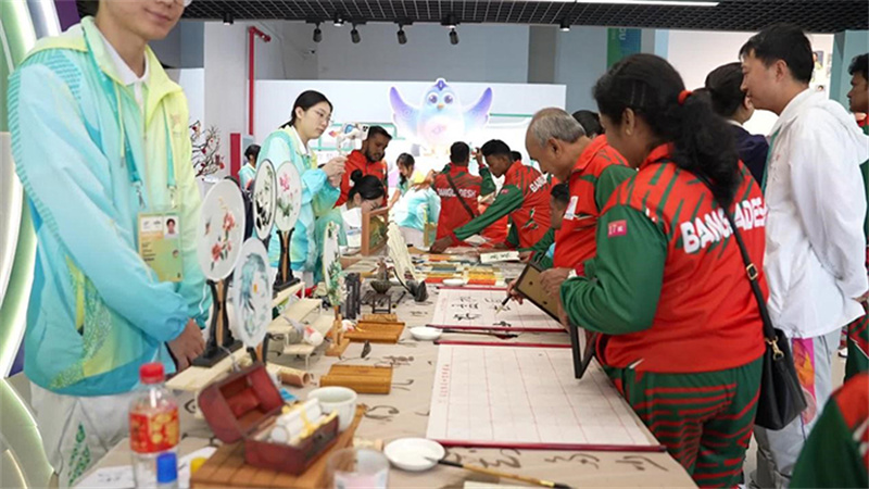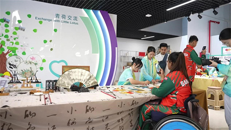 品嘗過美食,想要放松心情,志愿服務(wù)中心是個好去處。孟加拉國代表團的運動員們,正在“小青荷”的引導(dǎo)下參觀志愿服務(wù)文化展、體驗各類互動活動。