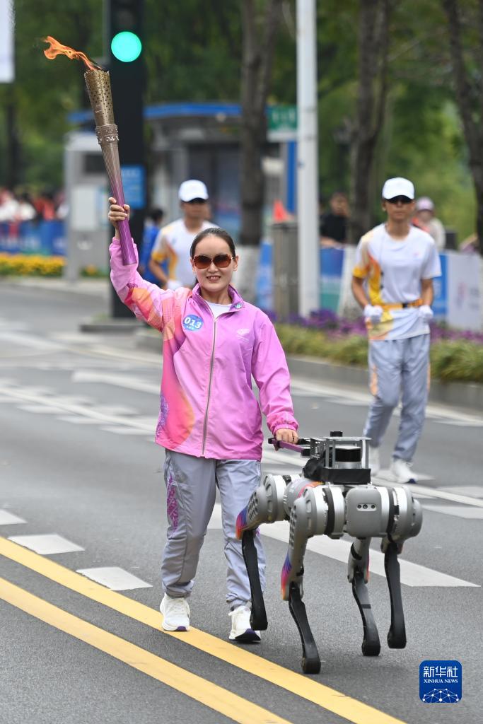 10月19日,火炬手蔡瓊卉在智能導盲犬的引導下進行火炬?zhèn)鬟f。這是智能導盲犬首次在大型賽事火炬?zhèn)鬟f中亮相,它以四足智能機器人視覺識別能力引導視障殘疾人行走。新華社記者 黃宗治 攝