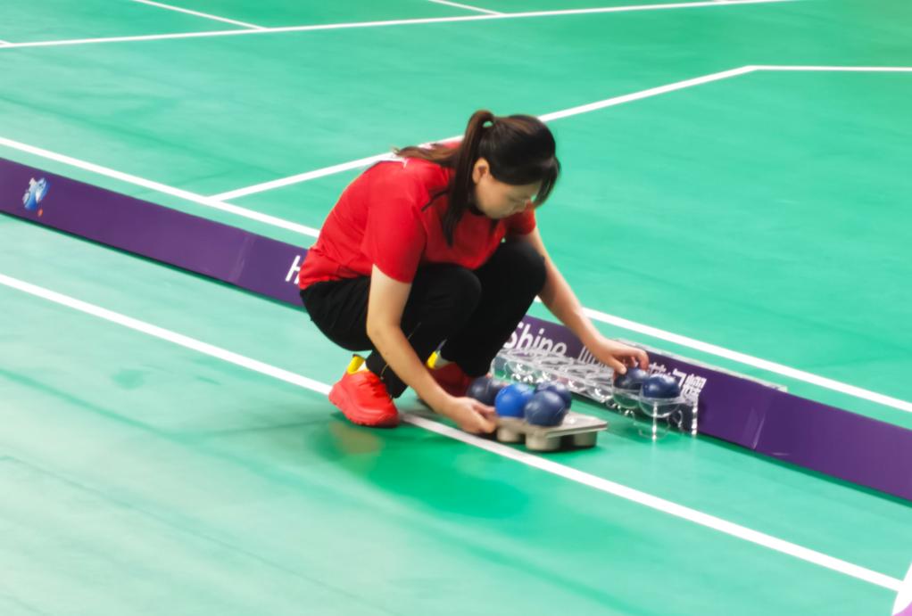 硬地滾球是最具包容性的殘疾人運(yùn)動(dòng)之一,專門為腦癱患者、嚴(yán)重軀體功能障礙的運(yùn)動(dòng)員而設(shè)立。其根據(jù)運(yùn)動(dòng)員殘疾程度分為4個(gè)級(jí)別,楊貝貝屬于其中較重的級(jí)別,無(wú)法獨(dú)立擲球,因此需要軌道器械和競(jìng)賽輔助人員的幫助。