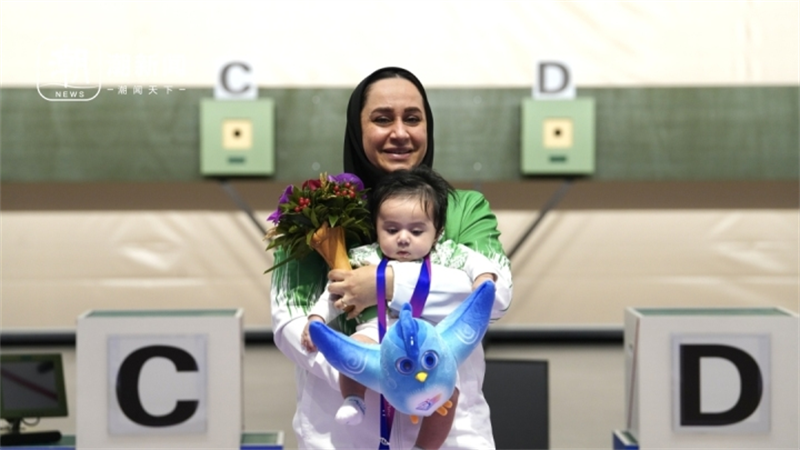 10月24日傍晚,富陽銀湖體育中心,杭州亞殘運(yùn)會(huì)射擊項(xiàng)目SH1級(jí)女子10米氣手槍頒獎(jiǎng)儀式上,銀牌得主、杭州亞殘運(yùn)會(huì)伊朗代表團(tuán)射擊運(yùn)動(dòng)員薩雷赫?賈萬馬爾迪一出場,就引得現(xiàn)場一片歡呼。