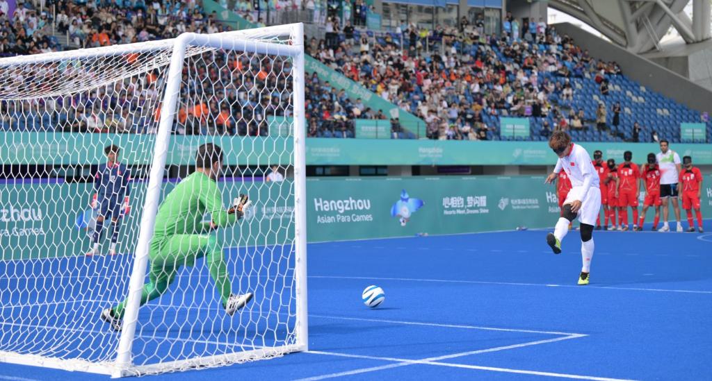10月28日,中國隊球員劉猛(中)在盲人足球決賽中射門,中國隊在點球大戰(zhàn)中以2:1戰(zhàn)勝伊朗隊奪冠。新華社記者才揚攝
