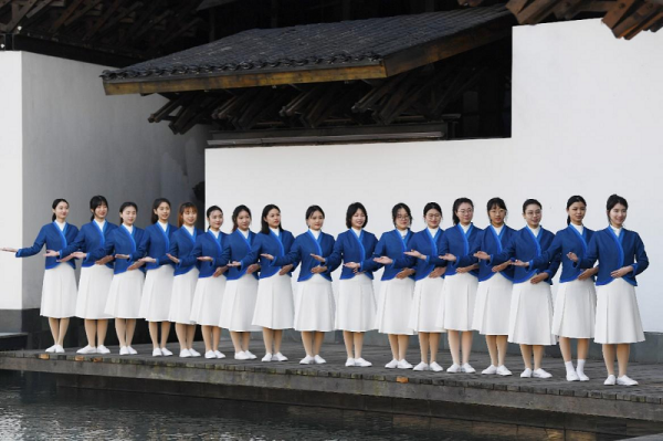 2022年11月6日,烏鎮(zhèn)互聯(lián)網(wǎng)國際會展中心,“小梧桐”志愿者拍攝合影