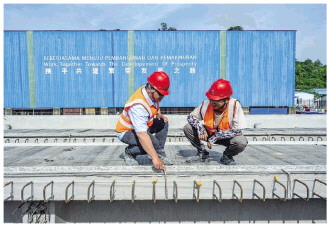 中馬共建“一帶一路”的標志性項目——馬來西亞東海岸鐵路(馬東鐵)建設如火如荼。圖為2023年4月26日,在馬來西亞吉蘭丹州的馬東鐵項目一分部制梁場,技術主管鄧友志(右)和馬來西亞本地青年員工鄧德緯討論生產(chǎn)情況。 新華社記者 朱煒 攝
